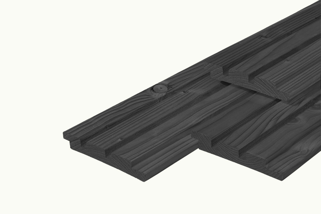 De douglas triple profiel geschaafd 19×130 mm zwart geïmpregneerde planken bieden een moderne, luxe uitstraling voor diverse buitentoepassingen, zoals gevelbekleding, schuttingen en tuinhuizen. Het unieke profiel zorgt voor een strakke en eigentijdse uitstraling en past bij zowel klassieke als moderne constructies.