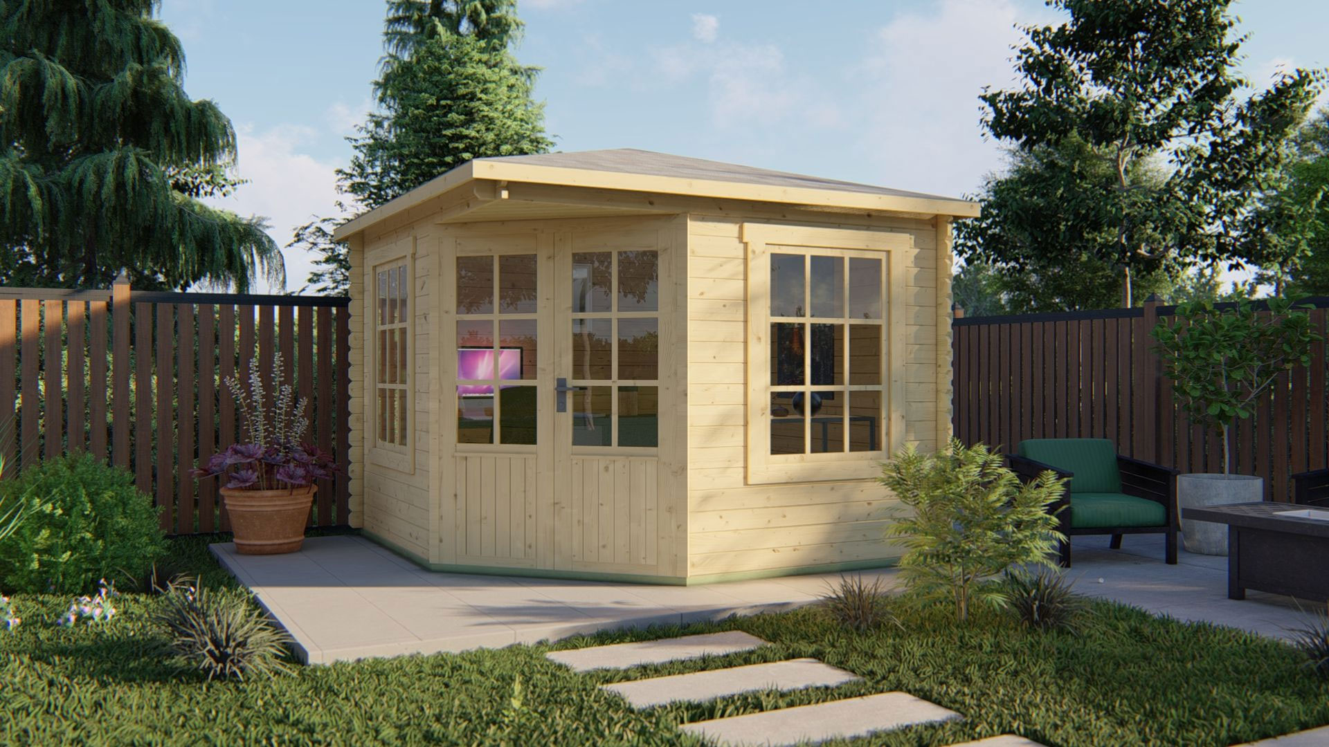 De Tuindeco blokhut Asmund is gemaakt van hoogwaardig Noord-Europees vuren. Uitgevoerd met een dubbele deur en 2 ramen met losse roedes. De grote glasoppervlakken in de deur en ramen zorgen voor een overvloed aan natuurlijk daglicht in de gehele binnenruimte.