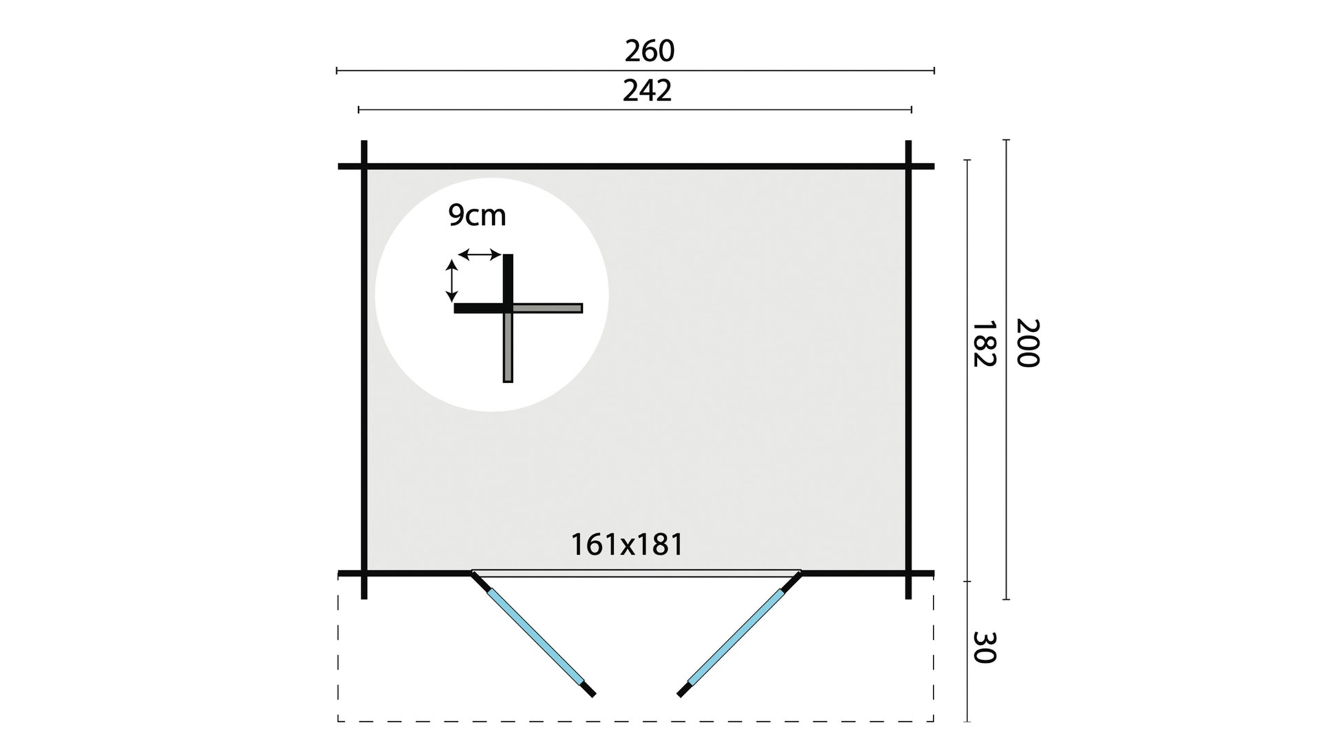De kunststof fundatieregels hebben een vlakke baan waarop de wand van de blokhut rust. De balk loopt vervolgens schuin af waardoor water altijd wegvloeit van de wand waarmee de kans op houtrot bij de onderste planken wordt tegen gegaan.