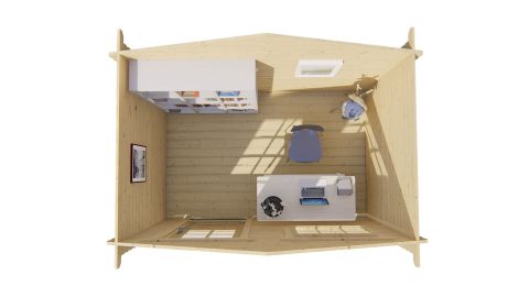 De kunststof fundatieregels hebben een vlakke baan waarop de wand van de blokhut rust. De balk loopt vervolgens schuin af waardoor water altijd wegvloeit van de wand waarmee de kans op houtrot bij de onderste planken wordt tegen gegaan.